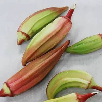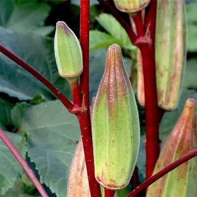 غلاف ها بسیار پهن تر از گونه های دیگر هستند و به رنگ سبز روشن با برجسته ها و رگه های مایل به قهوه ای هستند که اغلب در اطراف نوک و بالای غلاف ها جمع می شوند. غلاف های بلندتر ممکن است رنگ برنزی بیشتری نسبت به سبز داشته باشند. گفته می شود که غلاف های ساقه قرمز طعم بامیه سنتی تری دارند که شبیه بادمجان یا مارچوبه است.